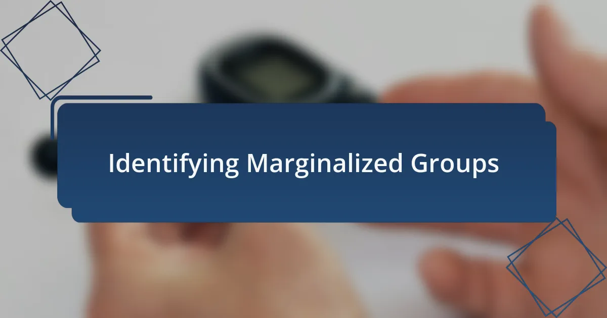 Identifying marginalized groups begins with understanding the unique challenges they face. For instance, during a recent community discussion, I observed how individuals with disabilities often felt invisible in conversations about accessibility. It struck me how vital it is to actively seek out and listen to these experiences, as they provide deeper insights into the barriers encountered daily.